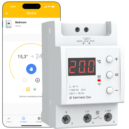 Smart Wi-Fi thermostat on a DIN rail up to 7 000 VA with geofencing and control from your smartphone. Save up to 50% energy with smart features.