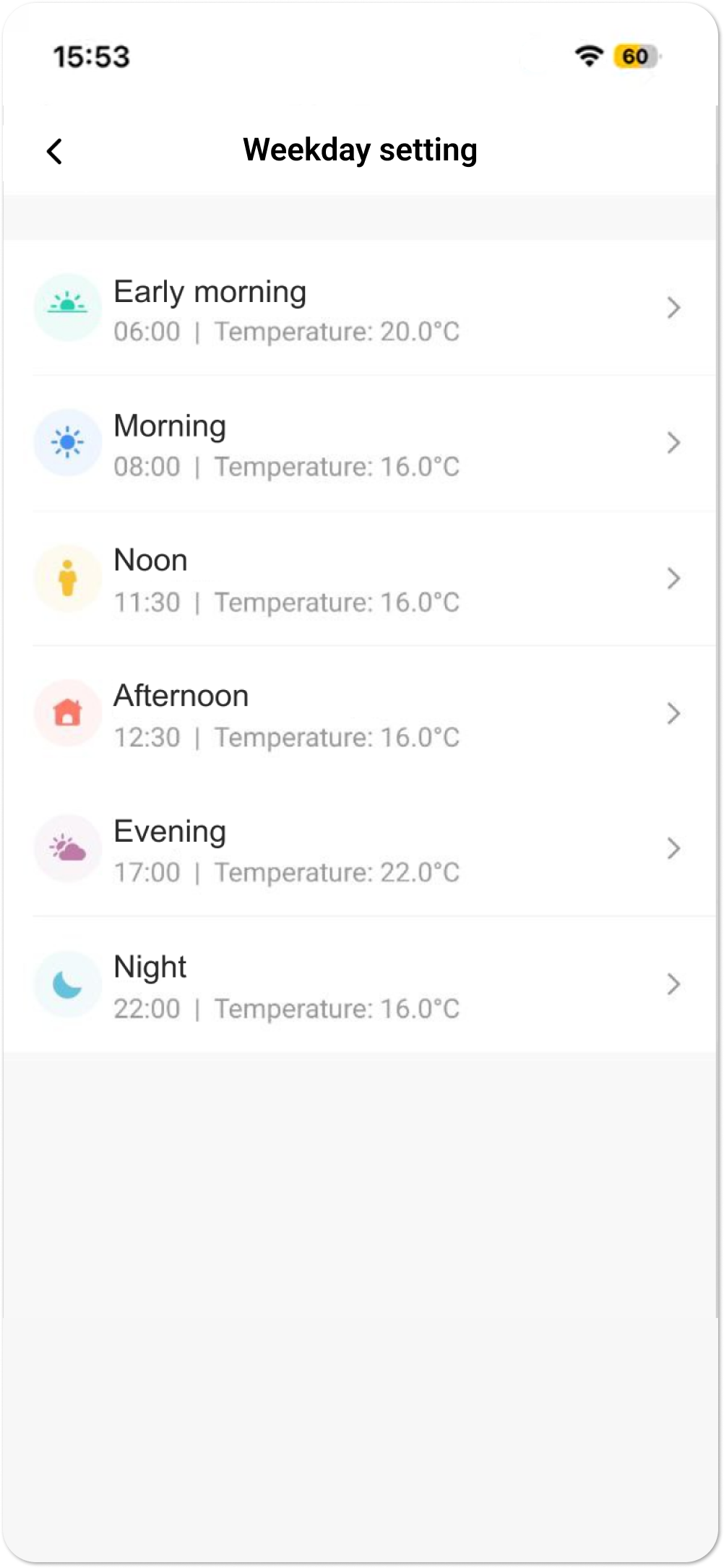 Weekly schedule — comfort by schedule, savings without effort Set automatic temperature control for the week so the thermostat switches to an energy-saving mode while you are at work and to a comfort mode on weekends.